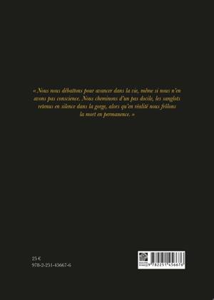 « Nous nous débattons pour avancer dans la vie, même si nous n’en avons pas conscience. Nous cheminons d’un pas docile, les sanglots retenus en silence dans la gorge, alors qu’en réalité nous frôlons la mort en permanence. »