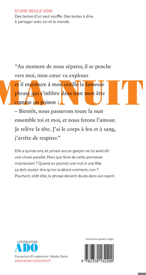 Elle a quinze ans et jamais aucun garçon ne lui avait dit une chose pareille. Mais que faire de cette promesse maintenant ? Quant on promet une nuit à une fille, ça doit vouloir dire qu'on la désire, non ? Pourtant, sitôt dite, la phrase devient doute dans son esprit.