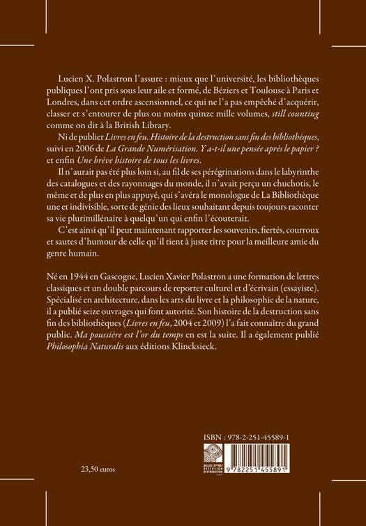Lucien X. Polastron l’assure : mieux que l’université, les bibliothèques publiques l’ont pris sous leur aile et formé, de Béziers et Toulouse à Paris et Londres, dans cet ordre ascensionnel, ce qui ne l’a pas empêché d’acquérir, classer et s’entourer de plus ou moins quinze mille volumes, still counting comme on dit à la British Library. Ni de publier Livres en feu. Histoire de la destruction sans fin des bibliothèques, suivi en 2006 de La Grande Numérisation. Y a-t-il une pensée après le papier ? et enfin Une brève histoire de tous les livres.