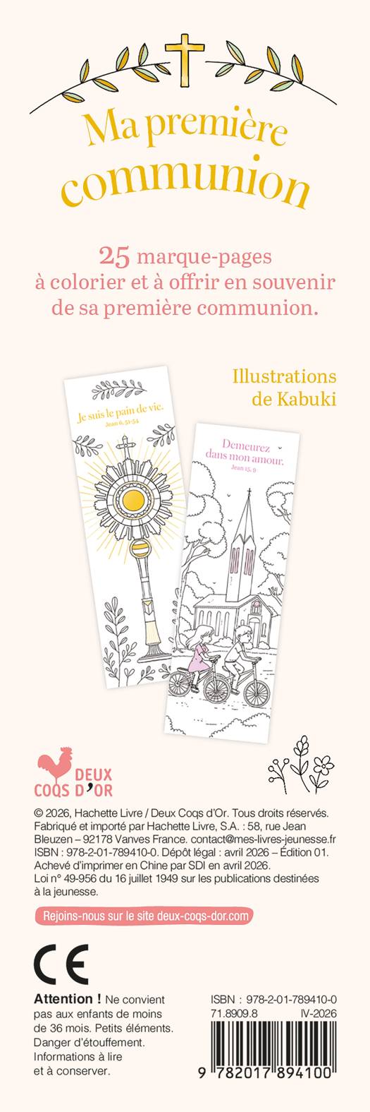 25 marque-pages à colorier et à offrir sur le thème de la première communion. Chaque marque-page contient une petite phrase adaptée, tirée de la Bible ou pas. 10 d'entre eux ont 100 % de fer à dorer. Au verso, l'enfant peut écrire la date et le lieu de sa première communion.