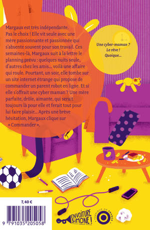 Margaux est très indépendante. Pas le choix ! Elle vit seule avec une mère passionnante et passionnée qui s'absente souvent pour son travail. Ces semaines-là, Margaux suit à la lettre le planning prévu : quelques nuits seule, d'autres chez les amis... voilà une affaire qui roule. Pourtant, un soir, elle tombe sur un site internet étrange qui propose de commander un parent robot en ligne. Et si elle s'offrait une cyber maman ? Une mère parfaite, drôle, aimante, qui serait toujours là pour elle et ferait tout pour lui faire plaisir... Après une brève hésitation, Margaux clique sur « Commander ».