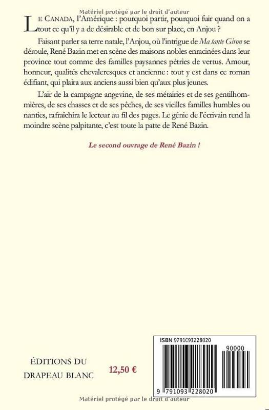 Le Canada, l'Amérique : pourquoi partir, pourquoi fuir quand on a tout ce qu'il y a de désirable et de bon sur place, en Anjou ? Faisant parler sa terre natale, l'Anjou, où l'intrigue de Ma tante Giron se déroule, René Bazin met en scène des maisons nobles enracinées dans leur province tout comme des familles paysannes pétries de vertus. Amour, honneur, qualités chevaleresques et ancienne : tout y est dans ce roman édifiant, qui plaira aux anciens aussi bien qu'aux plus jeunes. L'air de la campagne angevine, de ses métairies et de ses gentilhommières, de ses chasses et de ses pêches, de ses vieilles familles humbles ou nanties, rafraîchira le lecteur au fil des pages. Le génie de l'écrivain rend la moindre scène palpitante, c'est toute la patte de René Bazin. Le second ouvrage de René Bazin !