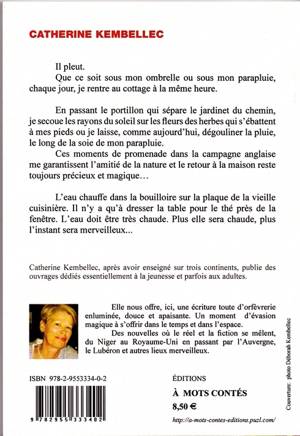 Il pleut. Que ce soit sous mon ombrelle ou sous mon parapluie, chaque jour, je rentre au cottage à la même heure. En passant le portillon qui sépare le jardinet du chemin, je secoue les rayons du soleil sur les fleurs des herbes qui s’ébattent à mes pieds ou je laisse, comme aujourd’hui, dégouliner la pluie, le long de la soie de mon parapluie. Ces moments de promenade dans la campagne anglaise me garantissent l’amitié de la nature et le retour à la maison reste toujours précieux et magique…