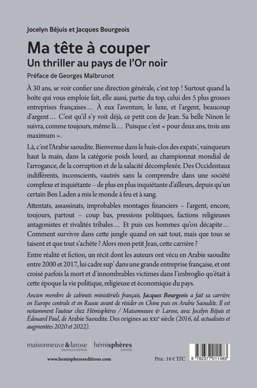 À 30 ans, se voir confier une direction générale, c’est top ! Surtout quand la boîte qui vous emploie fait, elle aussi, partie du top, celui des 5 plus grosses entreprises françaises... À eux l’aventure, le luxe, et l’argent, beaucoup d’argent... C’est qu’il s’y voit déjà, ce petit con de Jean. Sa belle Ninon le suivra, comme toujours, même là... Puisque c’est « pour deux ans, trois ans maximum ». Là, c’est l’Arabie saoudite. Bienvenue dans le huis-clos des expats', vainqueurs haut la main, dans la catégorie poids lourd, au championnat mondial de l’arrogance, de la corruption et de la salacité décomplexée. Des Occidentaux indifférents, inconscients, vautrés sans la comprendre dans une société complexe et inquiétante – de plus en plus inquiétante d’ailleurs, depuis qu’un certain Ben Laden a mis le monde à feu et à sang. Attentats, assassinats, improbables montages financiers – l’argent, encore, toujours, partout – coup bas, pressions politiques, factions religieuses antagonistes et rivalités tribales... Et puis ces hommes qu’on décapite... Comment survivre dans cette jungle quand on sait tout, mais que tous se taisent et que tout s’achète ? Alors mon petit Jean, cette carrière ?