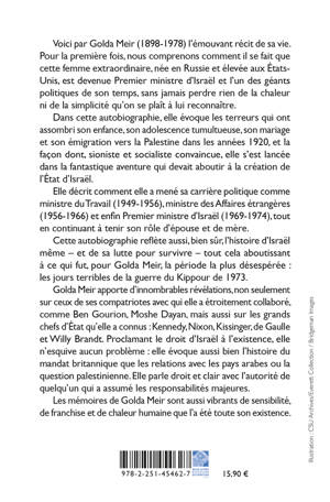 Voici par Golda Meir (1898-1978) l'emouvant recit de sa vie. Pour la premiere fois, nous comprenons comment il se fait que cette femme extraordinaire, nee en Russie et elevee aux Etats-Unis, est devenue Premier ministre d'Israel et l'un des geants politiques de son temps, sans jamais perdre rien de la chaleur ni de la simplicite qu'on se plait a lui reconnaitre. Dans cette autobiographie, elle evoque les terreurs qui ont assombri son enfance, son adolescence tumultueuse, son mariage et son emigration vers la Palestine dans les annees 1920, et la facon dont, sioniste et socialiste convaincue, elle s'est lancee dans la fantastique aventure qui devait aboutir a la creation de l'Etat d'Israel. Elle decrit comment elle a mene sa carriere politique comme ministre du Travail (1949-1956), ministre des Affaires etrangeres (1956-1966) et enfin Premier ministre d'Israel (1969-1974), tout en continuant a tenir son role d'epouse et de mere. Cette autobiographie reflete aussi, bien sur, l'histoire d'Israel meme - et de sa lutte pour survivre - tout cela aboutissant a ce qui fut, pour Golda Meir, la periode la plus desesperee: les jours terribles de la guerre du Kippour de 1973. Golda Meir apporte d'innombrables revelations, non seulement sur ceux de ses compatriotes avec qui elle a etroitement collabore, comme Ben Gourion, Moshe Dayan, mais aussi sur les grands chefs d'Etat qu'elle a connus: Kennedy, Nixon, Kissinger, de Gaulle et Willy Brandt. Proclamant le droit d'Israel a l'existence, elle n'esquive aucun probleme: elle evoque aussi bien l'histoire du mandat britannique que les relations avec les pays arabes ou la question palestinienne. Elle parle droit et clair avec l'autorite de quelqu'un qui a assume les responsabilites majeures. Les memoires de Golda Meir sont aussi vibrants de sensibilite, de franchise et de chaleur humaine que l'a ete toute son existence.