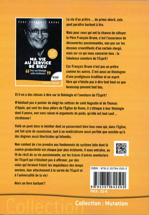 La vie d'un prêtre… de prime abord, cela peut paraître barbant à lire. Mais pour ceux qui ont la chance de côtoyer le Père François Brune, c'est l'assurance de découvertes passionnantes, non pas sur les dessous croustillants d'un certain clergé, mais sur ce qui nous concerne tous : la fabuleuse aventure de l'esprit ! Car François Brune n'est pas un prêtre comme les autres. C'est aussi un théologien d'une prodigieuse érudition et un esprit libre qui n'hésite pas à dire tout haut ce que beaucoup pensent tout bas. Et il en a des choses à dire sur la théologie et l'aventure de l'esprit ! N'hésitant pas à pointer du doigt les sottises de saint Augustin et de Thomas d'Aquin, qui sont les deux piliers de l'Eglise de Rome, il s'attaque à leur théologie dominante dont il pense, non sans raison ni arguments de poids, qu'elle est tout sauf… chrétienne ! Voilà un pavé dans le bénitier dont se passeraient bien tous ceux qui, dans l'Eglise, ont fait acte de soumission à un matérialisme aussi perfide que nuisible. Non content de s'en prendre aux fondements du système latin dont la contre-productivité est chaque jour plus éclatante, il nous entraine, au fil du récit de sa vie passionnante, sur les traces d'autres aventuriers de l'esprit qui n'hésitent pas à affirmer, par des voies qui feraient frémir les inquisiteurs des temps anciens, leur attachement à la survie de l'esprit et à l'universalité de la vie ! Alors un livre barbant ? Certainement pas, comme vous allez le découvrir !