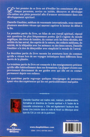 Danielle Gauthier, médium de renommée internationale, nous raconte plusieurs anecdotes vécues qui sauront captiver le lecteur du début à la fin. La première partie du livre, un bilan de son travail spirituel, répond aux questions les plus fréquemment posées. Qu’il s’agisse du monde angélique, des êtres de lumière, du contact avec les êtres décédés, des entités du bas astral, des esprits de la nature, des enfants médiums, du suicide, de la télépathie avec les animaux ou des âmes soeurs, Danielle Gauthier a le don de démystifier avec simplicité et légèreté le monde de l’astral. La deuxième partie du livre raconte les aventures hors du commun qu’elle a vécues lors de ses voyages initiatiques dans différents lieux sacrés de la planète. La troisième partie du livre est consacrée à des enseignements précieux qu’elle offre habituellement dans ses formations. La plupart d’entre eux proviennent directement de ses guides avec qui elle est en contact permanent depuis son enfance. La quatrième partie regroupe quelques témoignages de personnes ayant vécu des expériences qui les ont particulièrement marquées.