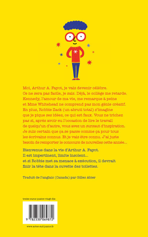 Moi, Arthur A. Fayot, je vais devenir célèbre. Ce ne sera pas facile, je sais. Déjà, le collège me retarde. Kennedy, l'amour de ma vie, me remarque à peine et Mme Whitehead ne comprend pas mon génie créatif. En plus, Robbie Zack (un abruti total) s'imagine que je pique ses idées, ce qui est faux. Vous ne trichez pas si, après avoir eu l'occasion de lire le travail de quelqu'un d'autre, vous avez un sursaut d'inspiration. Je suis certain que ça se passe comme ça pour tous les écrivains connus. Et je vais être connu. J'ai juste besoin de remporter le concours de nouvelles cette année...