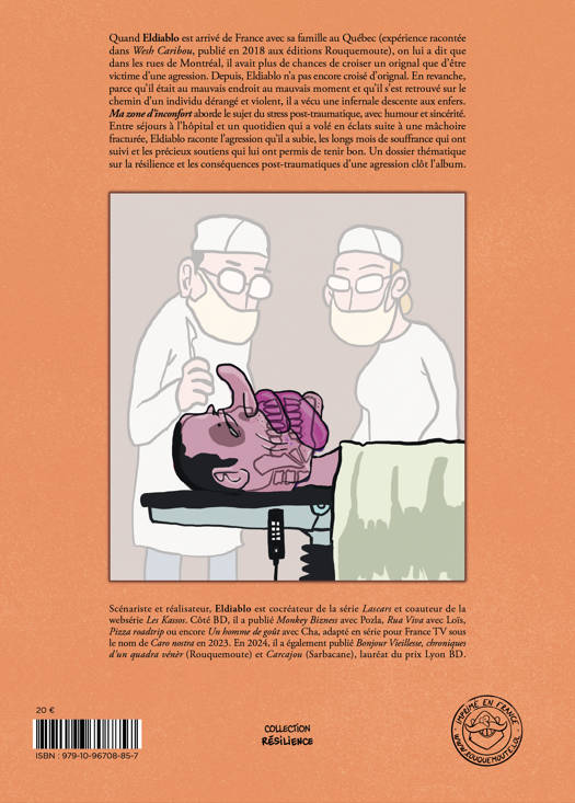 Quand Eldiablo est arrivé de France avec sa famille au Québec (expérience racontée dans Wesh Caribou, publié en 2018 aux éditions Rouquemoute), on lui a dit que dans les rues de Montréal, il avait plus de chances de croiser un orignal que d’être victime d’une agression. Depuis, Eldiablo n’a pas encore croisé d’orignal. En revanche, parce qu’il était au mauvais endroit au mauvais moment et qu’il s’est retrouvé sur le chemin d’un individu dérangé et violent, il a vécu une infernale descente aux enfers. Ma zone d’inconfort aborde le sujet du stress post-traumatique, avec humour et sincérité. Entre séjours à l’hôpital et un quotidien qui a volé en éclats suite à une mâchoire fracturée, Eldiablo raconte l’agression qu’il a subie, les longs mois de souffrance qui ont suivi et les précieux soutiens qui lui ont permis de tenir bon. Un dossier thématique sur la résilience et les conséquences post-traumatiques d’une agression clôt l’album. Scénariste et réalisateur, Eldiablo est cocréateur de la série Lascars et coauteur de la websérie Les Kassos. Côté BD, il a publié Monkey Bizness avec Polza, Rua Viva avec Loïs, Pizza roadtrip ou encore Un homme de goût avec Cha, adapté en série pour France TV sous le nom de Caro nostra en 2023. En 2024, il a également publié Bonjour Vieillesse, chroniques d’un quadra vénèr (Rouquemoute) et Carcajou (Sarbacane), lauréat du prix Lyon BD.