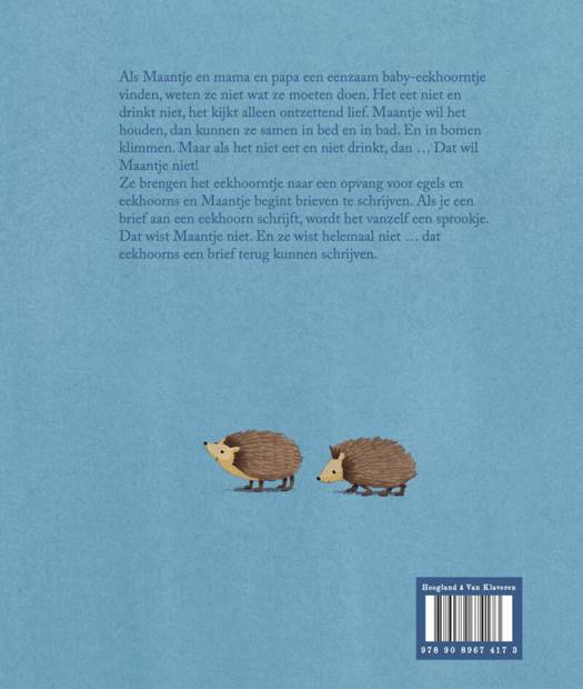 Als Maantje en mama en papa een eenzaam baby-eekhoorntje vinden, weten ze niet wat ze moeten doen. Het eet niet en drinkt niet, het kijkt alleen ontzettend lief. Maantje wil het houden, dan kunnen ze samen in bed en in bad. En in bomen klimmen. Maar als het niet eet en niet drinkt, dan … Dat wil Maantje niet! Ze brengen het eekhoorntje naar een opvang voor egels en eekhoorns en Maantje begint brieven te schrijven. Als je een brief aan een eekhoorn schrijft, wordt het vanzelf een sprookje. Dat wist Maantje niet. En ze wist helemaal niet … dat eekhoorns een brief terug kunnen schrijven.