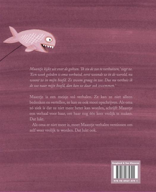 Maantje kijkt uit over de golven. ‘Ik sta de zee te verhuizen,’ zegt ze. ‘Een week geleden is oma verhuisd, eerst woonde ze in de wereld, nu woont ze in mijn hoofd. Ze zwom graag in zee. Dus nu verhuis ik de zee naar mijn hoofd, dan kan ze daar ook zwemmen.’