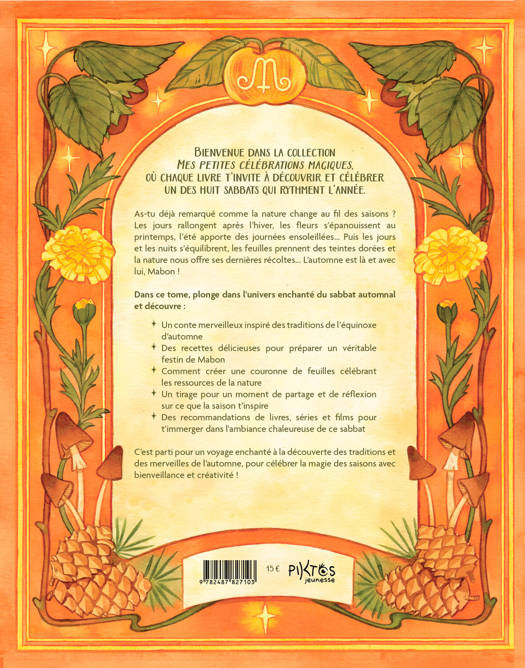 Bienvenue dans la collection Mes petites célébrations magiques, où chaque livre t'invite à découvrir et célébrer un des huit sabbats qui rythment l'année. As-tu déjà remarqué comme la nature change au fil des saisons ? Les jours rallongent après l’hiver, les fleurs s’épanouissent au printemps, l’été apporte des journées ensoleillées… Puis les jours et les nuits s’équilibrent, les feuilles prennent des teintes dorées et la nature nous offre ses dernières récoltes… L’automne est là et avec lui, Mabon ! Dans ce tome, plonge dans l’univers enchanté du sabbat automnal et découvre : un conte merveilleux inspiré des traditions de l’équinoxe d’automne ; des recettes délicieuses pour préparer un véritable festin de Mabon ; comment créer une couronne de feuilles célébrant les ressources de la nature ; un tirage pour un moment de partage et de réflexion sur ce que la saison t’inspire ; des recommandations de livres, séries et films pour t'immerger dans l'ambiance chaleureuse de ce sabbat. C’est parti pour un voyage enchanté à la découverte des traditions et des merveilles de l’automne, pour célébrer la magie des saisons avec bienveillance et créativité !