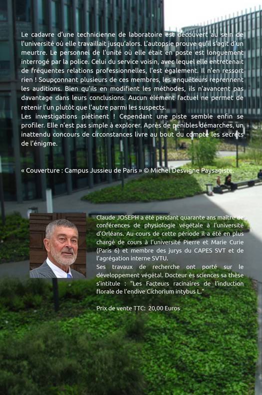 Le cadavre d’une technicienne de laboratoire est découvert au sein de l’université où elle travaillait jusqu’alors. L’autopsie prouve qu’il s’agit d’un meurtre. Le personnel de l’unité où elle était en poste est longuement interrogé par la police. Celui du service voisin, avec lequel elle entretenait de fréquentes relations professionnelles, l’est également. Il n’en ressort rien ! Soupçonnant plusieurs de ces membres, les enquêteurs reprennent les auditions. Bien qu’ils en modifient les méthodes, ils n’avancent pas davantage dans leurs conclusions. Aucun élément factuel ne permet de retenir l’un plutôt que l’autre parmi les suspects. Les investigations piétinent ! Cependant une piste semble enfin se profiler. Elle n’est pas simple à explorer. Après de pénibles démarches, un inattendu concours de circonstances livre au bout du compte les secrets de l’énigme.