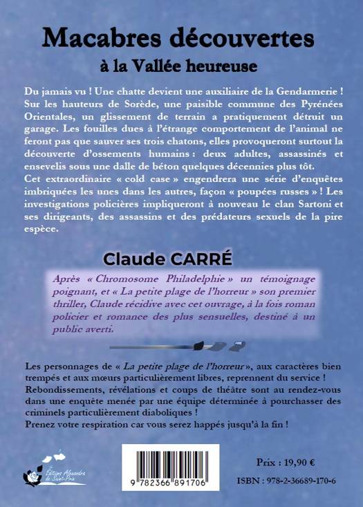 Du jamais vu ! Une chatte va devenir auxiliaire de Gendarmerie… Sur les hauteurs de Sorède, une paisible commune des Pyrénées Orientales, après un glissement de terrain et la destruction d’un garage, l’étrange comportement de cet animal va permettre de sauver ses trois chatons et d’extraire des décombres des ossements humains : deux adultes, assassinés et ensevelis sous la dalle de béton quelques décennies plus tôt. Cet extraordinaire « cold case » engendrera une série d’enquêtes imbriquées les unes dans les autres, façon « poupées russes ». Les investigations policières impliqueront à nouveau le clan Sartoni et ses dirigeants, des assassins et des prédateurs sexuels de la pire espèce. Les personnages de « La petite plage de l’horreur », aux caractères bien trempés et aux mœurs particulièrement libres, reprennent du service ! Rebondissements, révélations et coups de théâtre sont au rendez-vous dans une enquête menée par une équipe déterminée à pourchasser des criminels particulièrement diaboliques ! Prenez votre respiration car vous serez happés jusqu’à la fin !