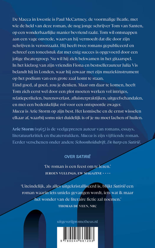 Arie Storm (1963) is de veelgeprezen auteur van romans, essays, literatuurkritiek en theaterstukken. Macca is zijn vijftiende roman. Eerder verschenen onder andere Schoonheidsdrift, De harp en Satirië.