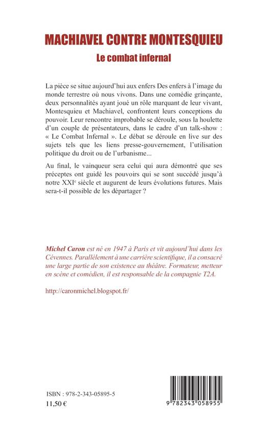 La pièce se situe aujourd'hui aux enfers Des enfers à l'image du monde terrestre où nous vivons. Dans une comédie grinçante, deux personnalités ayant joué un rôle marquant de leur vivant, Montesquieu et Machiavel, confrontent leurs conceptions du pouvoir. Leur rencontre improbable se déroule, sous la houlette d'un couple de présentateurs, dans le cadre d'un talk-show. Le débat se déroule en live sur des sujets tels que les liens presse-gouvernement, l'utilisation politique du droit ou de l'urbanisme...