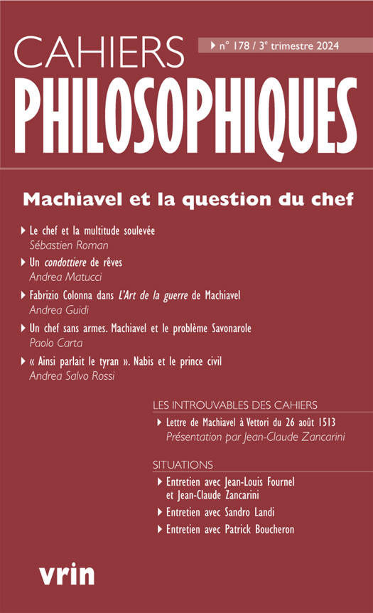 Sous la plume de Machiavel, plusieurs termes importants - celui d'Etat (stato) bien sur, celui de chef (capo) aussi - ont une signification qui n'est pas uniforme. Leur variation semantique, adequate a l'exigence machiavelienne de " percer la cause des variations des choses de ce monde ", procede de l'analyse d'une multiplicite de situations historiques et politiques qui articule references aux textes anciens et attention vive aux temps modernes. Aucune conceptualisation generale ni aucune idealisation du " chef " ne ressortent d'une lecture scrupuleuse des textes de Machiavel. Son observation rigoureuse des rapports de forces politiques et militaires ne separe nullement la reflexion sur les chefs d'une reflexion sur les peuples, les groupements ou les armees qui sont en vis-a-vis de ces chefs. Dans quelles circonstances, avec quelles attentes - plus ou moins imaginaires - et par quels moyens, une armee accepte-t-elle de se battre sous les ordres d'une autorite militaire; un peuple en vient-il a accepter de se soumettre a l'autorite politique d'un " chef " ou trouve-t-il la force de s'en affranchir?