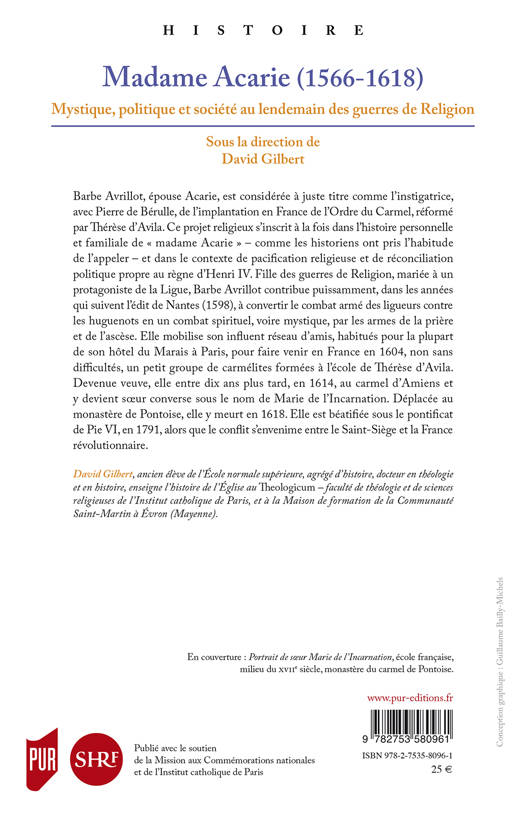 Barbe Avrillot, épouse Acarie, est considérée à juste titre comme l'instigatrice, avec Pierre de Bérulle, de l'implantation en France de l'Ordre du Carmel, réformé par Thérèse d'Avila. Fille des guerres de Religion, mariée à un protagoniste de la Ligue, «madame Acarie» - comme les historiens ont pris l'habitude de l'appeler - contribue puissamment, dans les années qui suivent l'édit de Nantes (1598), à convertir le combat armé des ligueurs contre les huguenots en un combat spirituel, voire mystique, par les armes de la prière et de l'ascèse.