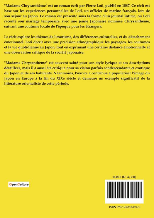 "Madame Chrysanthème" est un roman écrit par Pierre Loti, publié en 1887. Ce récit est basé sur les expériences personnelles de Loti, un officier de marine français, lors de son séjour au Japon. Le roman est présenté sous la forme d'un journal intime, où Loti raconte son mariage temporaire avec une jeune Japonaise nommée Chrysanthème, suivant une coutume locale de l'époque pour les étrangers.