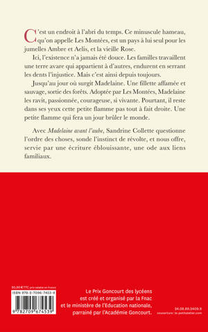 C’est un endroit à l’abri du temps. Ce minuscule hameau, qu’on appelle Les Montées, est un pays à lui seul pour les jumelles Ambre et Aelis, et la vieille Rose. Ici, l’existence n’a jamais été douce. Les familles travaillent une terre avare qui appartient à d’autres, endurent en serrant les dents l’injustice. Mais c’est ainsi depuis toujours. Jusqu’au jour où surgit Madelaine. Une fillette affamée et sauvage, sortie des forêts. Adoptée par Les Montées, Madelaine les ravit, passionnée, courageuse, si vivante. Pourtant, il reste dans ses yeux cette petite flamme pas tout à fait droite. Une petite flamme qui fera un jour brûler le monde.
