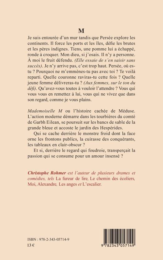 Mademoiselle M ou l'histoire cachée de Méduse. L'action moderne démarre dans les tourbières du comté de Garbh Eilean, se poursuit sur les bancs de sable de la grande bleue et accoste le jardin des Hespérides. Qui se cache derrière le monstre froid dont la face orne les frontons publics, la cuirasse des conquérants, les tableaux en clair-obscur ? Et si, derrière le regard qui foudroie, transperçait la passion qui se consume pour un amour insensé ?