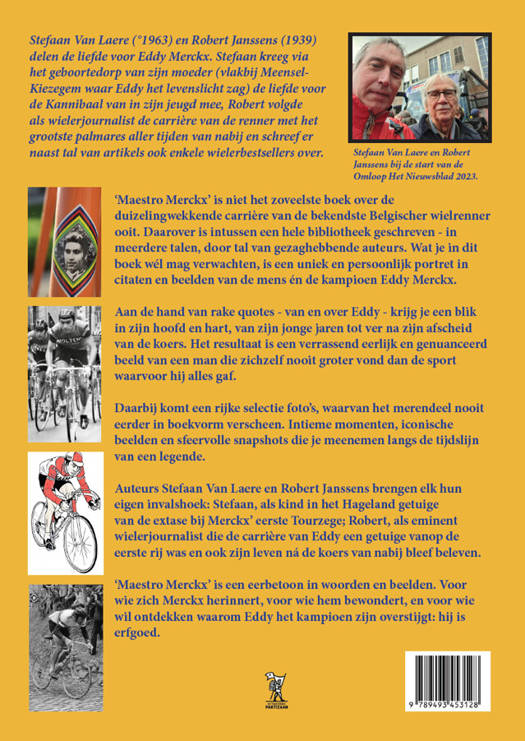 Stefaan Van Laere (°1963) en Robert Janssens (1939) delen de liefde voor Eddy Merckx. Stefaan kreeg via het geboortedorp van zijn moeder (vlakbij Meensel-Kiezegem waar Eddy het levenslicht zag) de liefde voor de Kannibaal van in zijn jeugd mee, Robert volgde als wielerjournalist de carrière van de renner met het grootste palmares aller tijden van nabij en schreef er naast tal van artikels ook enkele wielerbestsellers over.