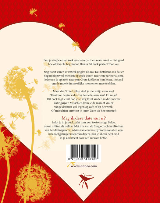 De Parship-datingbijbel Ben je single en op zoek naar een partner, maar weet je niet goed hoe of waar te beginnen? Dan is dit boek perfect voor jou! Nog nooit waren er zo veel singles als nu. Dat betekent ook dat er nog nooit zo veel mensen op zoek waren naar een partner als nu. Iedereen is op zoek naar een Grote Liefde in hun leven. Iemand om de mooie én moeilijke momenten mee te delen. Maar die Grote Liefde vind je niet altijd even snel. Want hoe begin je daar in hemelsnaam aan? En waar? Dit boek legt je uit hoe je je weg kunt vinden in die enorme datingvijver. Misschien kom je de man of vrouw van je dromen wel tegen op café of op het werk. Of misschien ontmoet je jouw Ware wel via het internet! Mag ik deze date van u? helpt je in je zoektocht naar een toekomstige liefde, zowel offline als online. Met tips van de singlecoach in elke fase van het datingproces, advies van een beautyprofessional en een heleboel getuigenissen van daters, ben je al een heel eind in je zoektocht naar een nieuwe liefde.