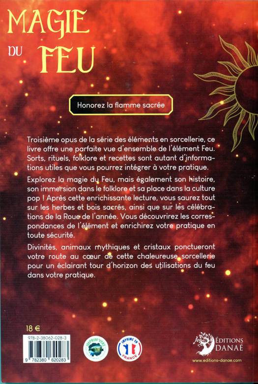 Honorez la flamme sacrée Troisième opus de la série des éléments en sorcellerie, ce livre offre une parfaite vue d’ensemble de l’élément Feu. Sorts, rituels, folklore et recettes sont autant d’informations utiles que vous pourrez intégrer à votre pratique. Explorez la magie du Feu, mais également son histoire, son immersion dans le folklore et sa place dans la culture pop ! Après cette enrichissante lecture, vous saurez tout sur les herbes et bois sacrés, ainsi que sur les célébrations de la Roue de l’année. Vous découvrirez les correspondances de l’élément et enrichirez votre pratique en toute sécurité. Divinités, animaux mythiques et cristaux ponctueront votre route au cœur de cette chaleureuse sorcellerie pour un éclairant tour d’horizon des utilisations du feu dans votre pratique.