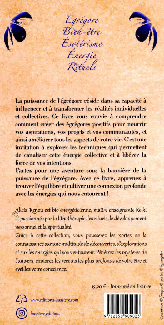 Savez-vous ce qu'est un égrégore ? Sa puissance réside dans sa capacité à influencer et à transformer les réalités individuelles et collectives. Alicia Renou vous invite à comprendre comment créer des égrégores positifs pour nourrir vos aspirations, vos projets et vos communautés, bref pour améliorer tous les aspects de votre vie. C'est une invitation à explorer les techniques qui permettent de canaliser cette énergie qui est collective, à libérer la force de vos intentions et à vous laisser guider par les énergies positives qui émanent de chaque page. Que vous soyez un novice en quête de connaissances énergétiques, un praticien aguerri ou simplement un curieux du monde énergétique, vous partez avec cet ouvrage pour une aventure sous la bannière de la puissance de l'égrégore. Chaque rituel, chaque exploration à laquelle vous invite ce livre sera une opportunité de comprendre les mécanismes de ces entités énergétiques, de trouver l'équilibre et de cultiver une connexion profonde avec les énergies qui nous entourent.