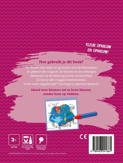 Vul de pen met water en ga ermee over de kleurplaten. Er gebeurt iets magisch: de kleuren en de verborgen elementen uit de tekening komen tevoorschijn! Zo kun je alle vraagjes beantwoorden. Is het water opgedroogd? Dan begin je gewoon opnieuw!