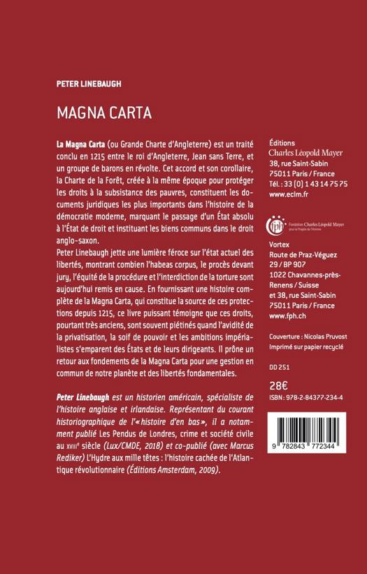 La Magna Carta (ou Grande Charte d'Angleterre) est un traité conclu en 1215 entre le roi d'Angleterre, Jean sans terre, et un groupe de barons à l'origine d'une révolte. Cet accord et son corolaire, la Charte de la Forêt, créée à la même époque pour protéger les droits à la subsistance des pauvres, constituent les documents juridiques les plus importants dans l'histoire de la démocratie moderne, marquant le passage d'un État absolu à l'État de droit et instituant les biens communs dans le droit anglo-saxon. Peter Linebaugh jette une lumière féroce sur l'état actuel des libertés, démontrant combien l'habeas corpus, le procès devant jury, l'équité de la procédure et l'interdiction de la torture sont aujourd'hui remis en cause. En fournissant une histoire complète de la Magna Carta, qui constitue la source de ces protections depuis 1215, ce livre puissant démontre comment ces droits pourtant très anciens sont fréquemment mis de côté lorsque l'avidité de la privatisation, la soif de pouvoir et les ambitions impérialistes s'emparent des États. Il prône un retour aux fondements de la Magna Carta pour une gestion en commun de notre planète et des libertés fondamentales.
