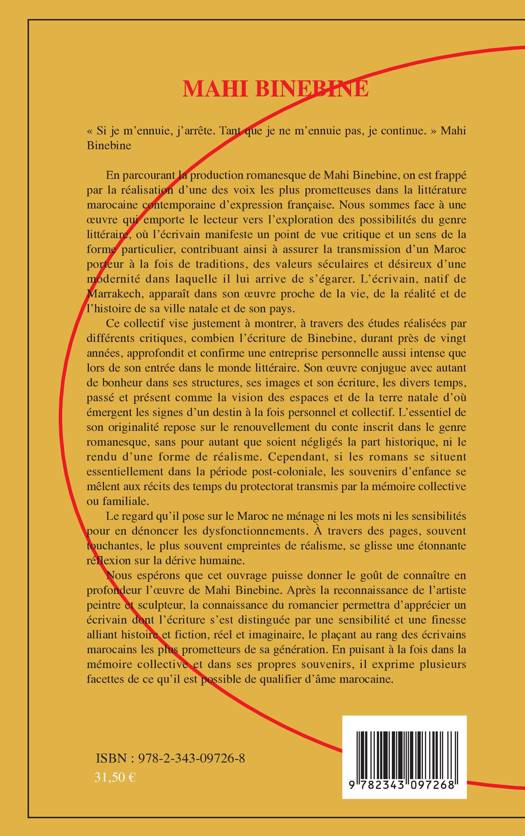 En parcourant la production romanesque de Mahi Binebine, on est frappé par la réalisation d'une des voix les plus prometteuses dans la littérature marocaine contemporaine d'expression française. L'écrivain, natif de Marrakech, apparaît dans son oeuvre proche de la vie, de la réalité et de l'histoire de sa ville natale et de son pays. Si ses romans se situent dans la période postcoloniale, les souvenirs d'enfance se mêlent aux récits des temps du protectorat transmis par la mémoire collective ou familiale. A travers des pages souvent touchantes, mais empreintes de réalisme, se glisse une étonnante réflexion sur la dérive humaine.