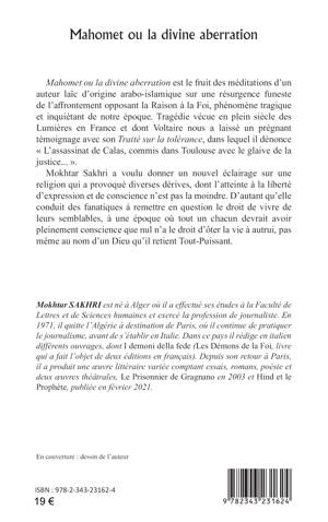 Mahomet ou la divine aberration est le fruit des méditations d'un auteur laïc d'origine arabo-islamique sur une résurgence funeste de l'affrontement opposant la Raison à la Foi. Mokhtar Sakhri a voulu donner un nouvel éclairage sur une religion qui a provoqué diverses dérives. D'autant qu'elle conduit des fanatiques à remettre en question le droit de vivre de leurs semblables, à une époque où tout un chacun devrait avoir pleinement conscience que nul n'a le droit d'ôter la vie.