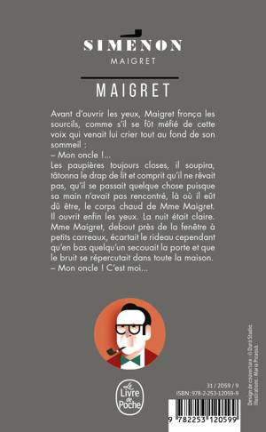 Avant d'ouvrir les yeux, Maigret fronça les sourcils, comme s'il se fût méfié de cette voix qui venait lui crier tout au fond de son sommeil: - Mon oncle !... Les paupières toujours closes, il soupira, tâtonna le drap de lit et comprit qu'il ne rèvait pas, qu'il se passait quelque chose puisque sa main n'avait pas rencontré, là où il eût dû ètre, le corps chaud de Mme Maigret. Il ouvrit enfin les yeux. La nuit était claire. Mme Maigret, debout près de la fenètre à petits carreaux, écartait le rideau cependant qu'en bas quelqu'un secouait la porte et que le bruit se répercutait dans toute la maison. - Mon oncle ! C'est moi...