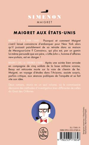 Maigret chez le coroner (1949) : Après une soirée bien arrosée en compagnie de cinq soldats de la base militaire voisine, Bessy est retrouvée morte sur la voie de chemin de fer. Maigret en voyage d’études dans l’Arizona, « à deux pas de la frontière mexicaine », assiste surpris, parfois réprobateur, aux séances publiques de l’enquête et se fait vite son idée.