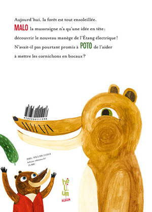 Aujourd'hui, la forêt est tout ensoleillée. Malo la musaraigne n'a qu'une idée en tête : découvrir le nouveau manège de l'Étang électrique ! N'avait-il pas pourtant promis à Poto de l'aider à mettre des cornichons en bocaux?