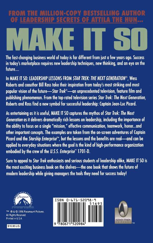Make It So: Leadership Lessons from Star Trek: The Next Generation(R), Wess Roberts and coauthor Bill Ross take their inspiration from today's most striking and most popular vision of the future --