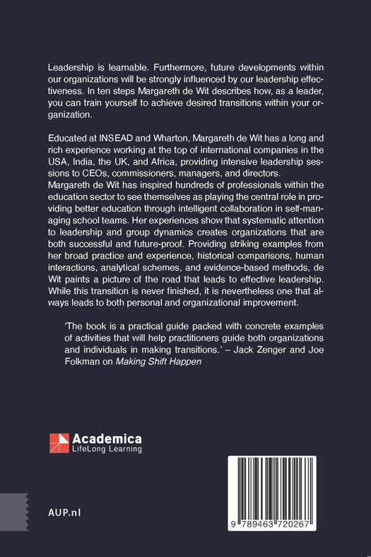 Leadership is learnable. Furthermore, future developments within our organizations will be strongly influenced by our leadership effectiveness. In ten steps Margareth de Wit describes how, as a leader, you can train yourself to achieve desired transitions within your organization. Educated at INSEAD and Wharton, Margareth de Wit has a long and rich experience working at the top of international companies in the USA, India, the UK, and Africa, providing intensive leadership sessions to CEOs, commissioners, managers, and directors.