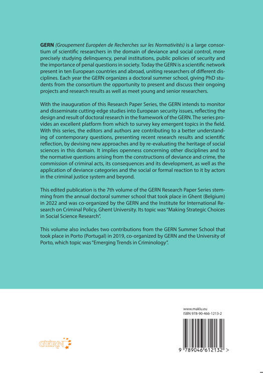 This volume also includes two contributions from the GERN Summer School that took place in Porto (Portugal) in 2019, co-organized by GERN and the University of Porto, which topic was “Emerging Trends in Criminology”.