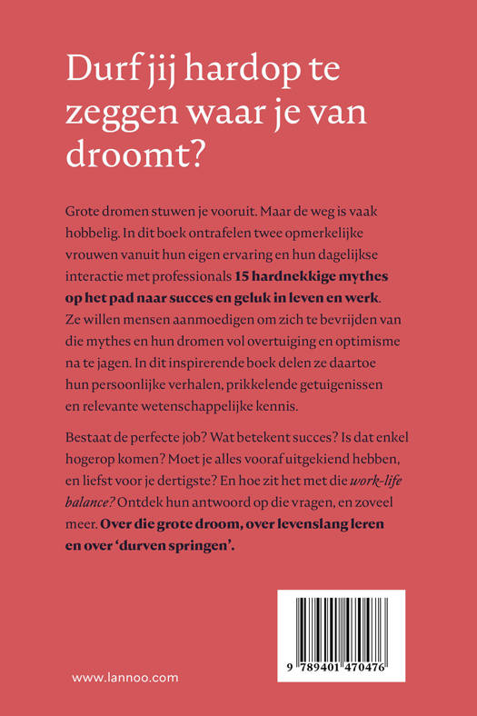 Grote dromen stuwen je vooruit. Maar de weg is vaak hobbelig. In dit boek ontrafelen twee opmerkelijke vrouwen vanuit hun eigen ervaring en hun dagelijkse interactie met professionals 15 hardnekkige mythes op het pad naar succes en geluk in leven en werk. Ze willen mensen aanmoedigen om zich te bevrijden van die mythes en hun dromen vol overtuiging en optimisme na te jagen. In dit inspirerende boek delen ze daartoe hun persoonlijke verhalen, prikkelende getuigenissen en relevante wetenschappelijke kennis.
