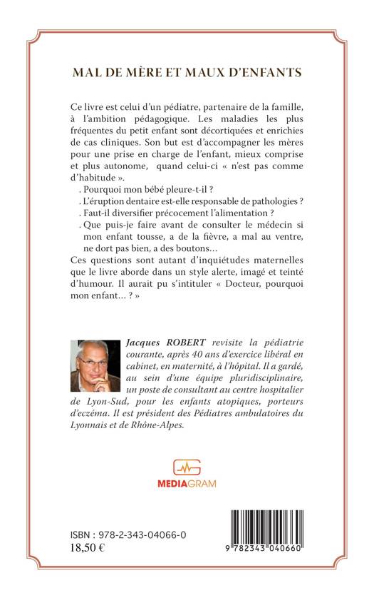 S'appuyant sur quarante ans d'expériences cliniques, Jacques Robert, pédiatre, décortique ici les maladies les plus fréquentes du petit enfant. Son but est d'accompagner les mères pour une prise en charge de l'enfant, quand celui-ci n'est pas comme d'habitude : - Pourquoi mon bébé pleure-t-il ? - L'éruption dentaire est-elle responsable de pathologie ? Faut-il diversifier précocement l'alimentation ? Que faire avant de consulter le médecin si mon enfant tousse, a de la fièvre, mal au ventre... ?