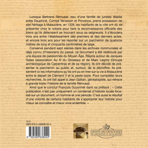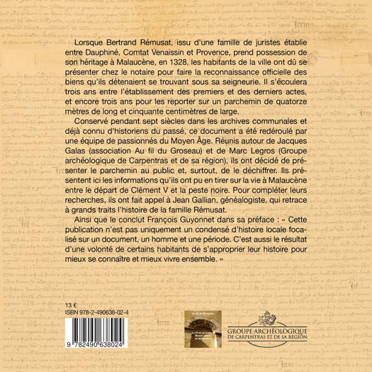 Lorsque Bertrand Rémusat, issu d’une famille de juristes établie entre Dauphiné, Comtat Venaissin et Provence, prend possession de son héritage à Malaucène, en 1328, les habitants de la ville ont dû se présenter chez le notaire pour faire la reconnaissance officielle des biens qu’ils détenaient se trouvant sous sa seigneurie. Il s’écoulera trois ans entre l’établissement des premiers et des derniers actes, et encore trois ans pour les reporter sur un parchemin de quatorze mètres de long et cinquante centimètres de large. Conservé pendant sept siècles dans les archives communales et déjà connu d’historiens du passé, ce document a été redéroulé par une équipe de passionnés du Moyen Âge. Réunis autour de Jacques Galas (association Au fil du Groseau) et de Marc Legros (Groupe archéologique de Carpentras et de sa région), ils ont décidé de présenter le parchemin au public et, surtout, de le déchiffrer. Ils présentent ici les informations qu’ils ont pu en tirer sur la vie à Malaucène entre le départ de Clément V et la peste noire. Pour compléter leurs recherches, ils ont fait appel à Jean Gallian, généalogiste, qui retrace à grands traits l’histoire de la famille Rémusat. Ainsi que le conclut François Guyonnet dans sa préface : « Cette publication n’est pas uniquement un condensé d’histoire locale focalisé sur un document, un homme et une période. C’est aussi le résultat d’une volonté de certains habitants de s’approprier leur histoire pour mieux se connaître et mieux vivre ensemble. »