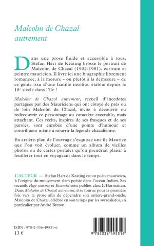 Dans une prose fluide et accessible à tous, Stefan Hart de Keating brosse le portrait de Malcolm de Chazal (1902-1981), écrivain et peintre mauricien. Il livre ici une biographie librement romancée, à la mesure – ou plutôt à la démesure – de ce génie issu d’une famille insolite, établie depuis le 18e siècle dans l’île ! Malcolm de Chazal autrement, recueil d’anecdotes partagées par des Mauriciens qui ont côtoyé de près ou de loin Malcolm de Chazal, invite à découvrir ou redécouvrir ce personnage au caractère exécrable, mais attachant. Ces récits, inspirés de ses frasques et de ses paroles, sont enrobés d’une pointe d’humour et contribuent même à nourrir la légende chazalienne. En arrière-plan de l’ouvrage s’esquisse une île Maurice que l’on voit évoluer, comme un album de vieilles photos ou de cartes postales qu’on prendrait plaisir à feuilleter tout en voyageant dans le temps.