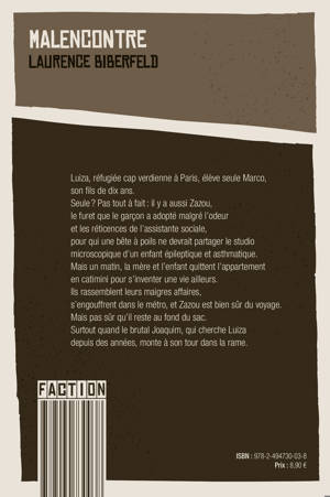 Luiza, réfugiée cap-verdienne à Paris, élève seule Marco, son fils de dix ans. SeuleÂÂ ? Pas tout à fait : il y a aussi Zazou, le furet que le garçon a adopté malgré l'odeur et les réticences de l'assistante sociale, pour qui une bête à poils ne devrait partager le studio microscopique d'un enfant épileptique et asthmatique. Mais un matin, la mère et l'enfant quittent l'appartement en catimini pour s'inventer une vie ailleurs. Ils rassemblent leurs maigres affaires, s'engouffrent dans le métro, et Zazou est bien sûr du voyage. Pas certain qu'il reste au fond du sac. Surtout quand le brutal Joaquim, qui cherche Luiza depuis des années, monte à son tour dans la rame.