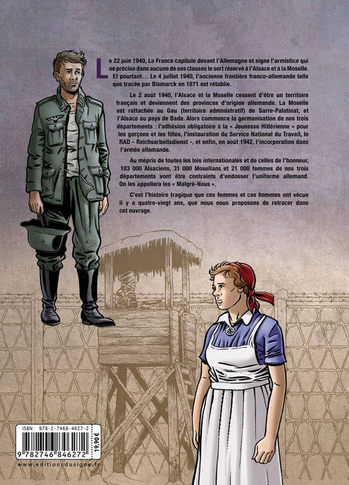 La BD retrace l'histoire des incorporés de force d'Alsace et de Moselle pendant la seconde guerre mondiale, à la fois l'incorporation des hommes mais également des filles. ⢠100 000 Alsaciens et 30 000 Lorrains ont été incorporés de force dans l'armée allemande entre aout 1942 et le début de 1945. La BD retrace l'histoire de ces femmes et de ces hommes, en commençant par l'endoctrinement dès l'occupation des trois départements par les nazis, les jeunesses hitlériennes, les convocations pour visites médicales, l'incorporation proprement dite, l'envoi sur les différents fronts mais principalement sur ceux de l'Est en URSS, la mort au front, l'internement dans les camps, la libération et le retour au pays natal Points forts : absolument historique. L'ouvrage repose sur des écrits avérés, vérifiés et ne souffrant la moindre contestation. "