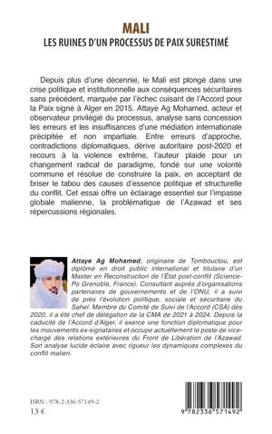 Depuis plus d'une décennie, le Mali est plongé dans une crise politique et institutionnelle aux conséquences sécuritaires sans précédent, marquée par l'échec cuisant de l'Accord pour la Paix signé à Alger en 2015. Attaye Ag Mohamed, acteur et observateur privilégié du processus, analyse sans concession les erreurs et les insuffisances d'une médiation internationale précipitée et non impartiale. Entre erreurs d'approche, contradictions diplomatiques, dérive autoritaire post-2020 et recours à la violence extrême, l'auteur plaide pour un changement radical de paradigme, fondé sur une volonté commune et résolue de construire la paix, en acceptant de briser le tabou des causes d'essence politique et structurelle du conflit. Cet essai offre un éclairage essentiel sur l'impasse globale malienne, la problématique de l'Azawad et ses répercussions régionales.