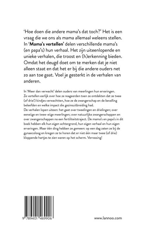'Hoe doen die andere mama's dat toch?' Het is een vraag die we ons als mama allemaal weleens stellen. In 'Mama's vertellen' delen verschillende mama's (en papa's) hun verhaal. Het zijn uiteenlopende en unieke verhalen, die troost en (h)erkenning bieden. Omdat het deugd doet om te merken dat je niet alleen staat en dat het er bij die andere ouders net zo aan toe gaat. Voel je gesterkt in de verhalen van anderen. In 'Meer dan verwacht' delen ouders van meerlingen hun ervaringen. Ze vertellen eerlijk over hoe ze reageerden toen ze ontdekten dat ze twee (of drie!) kindjes verwachtten, hoe ze de zwangerschap en de bevalling beleefden en welke impact die gezinsuitbreiding had. De verhalen lopen uiteen: het gaat over tweelingen en drielingen; over eeneiige en twee-eiige meerlingen; over natuurlijke zwangerschappen en over zwangerschappen na een fertiliteitstraject. De mama's en papa's in dit boek hebben elk hun eigen achtergrond, hun eigen verhaal en hun eigen ervaringen. Maar &één ding hebben ze gemeen: op een dag zaten ze bij de gynaecoloog en kregen ze te horen dat er niet één maar twee (of drie) kloppende hartjes te zien waren op het scherm. Verrassing!