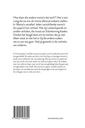 'Hoe doen die andere mama's dat toch?' Het is een vraag die we ons als mama allemaal weleens stellen. In 'Mama's vertellen' delen verschillende mama's (en papa's) hun verhaal. Het zijn uiteenlopende en unieke verhalen, die troost en (h)erkenning bieden. Omdat het deugd doet om te merken dat je niet alleen staat en dat het er bij die andere ouders net zo aan toe gaat. Voel je gesterkt in de verhalen van anderen. In 'Ontroostbaar' vertellen mama's en papa's over hun baby die meer huilt dan gemiddeld. Ze voelen aan dat er iets niet klopt, en bewegen hemel en aarde in hun zoektocht naar een oplossing. Het zijn mama's en papa's die moe zijn, en die niet meer weten van welk hout pijlen maken. Ze snakken naar rust, stilte en slaap; maar vooral naar een gelukkige baby die geen pijn of ongemakken meer heeft. Die mama's en papa's vertellen eerlijk over de impact van een baby die veel huilt, de gevolgen ervan op het gezin en het onbegrip waar ze vaak op stuiten.