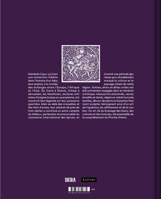 Mamtouks (1250-1517) est une immersion inédite dans l'histoire d'un fabuleux empire, à la croisée des échanges entre l'Europe, l'Afrique et l'Asie. Du Caire à Damas, d'Alep à Jérusalem, les Mamlouks, esclaves militaires d'origine turque ou caucasienne, ont construit leur légende sur leur puissance guerrière. Mais au-delà des conquêtes et des faits d'armes, leur sultanat de près de trois siècles a constitué un autre « empire du Milieu », partenaire incontournable du commerce international des épices, et incarné une période glorieuse qui a durablement marqué la culture et le paysage urbain de cette région. Sultans, émirs et élites civiles ont été activement engagés dans le mécénat artistique. Manuscrits enluminés, verres émaillés et dorés, objets en métal incrusté, textiles, décors de pierre et boiseries finement sculptés témoignent ainsi d'un art de l'opulence, du raffinement et de la couleur. Un art né du brassage des biens, des cultures et des hommes, clé essentielle de la compréhension du Proche-Orient.