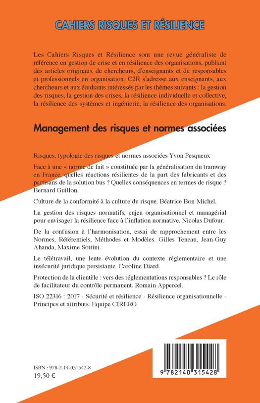Dans ce numéro : Risques, typologie des risques et normes associées Yvon Pesqueux ; Face à une « norme de fait » constituée par la généralisation du tramway en France, quelles réactions résilientes de la part des fabricants et des partisans de la solution bus ? Quelles conséquences en termes de risque ? Bernard Guillon ; Culture de la conformité à la culture du risque Béatrice Bon-Michel ; La gestion des risques normatifs, enjeu organisationnel et managérial pour envisager la résilience face à l'inflation normative Nicolas Dufour ; De la confusion à l'harmonisation, essai de rapprochement entre les Normes, Référentiels, Méthodes et Modèles Gilles Teneau, Jean-Guy Ahanda et Maxime Sottini ; Le télétravail, une lente évolution du contexte réglementaire et une insécurité juridique persistante Caroline Diard ; Protection de la clientèle : vers des réglementations responsables ? Le rôle de facilitateur du contrôle permanent Romain Appercel.